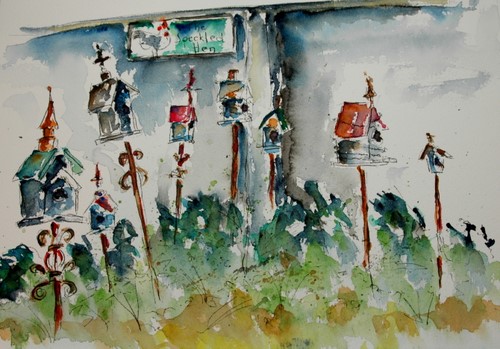 “The Speckled Hen”. selling all kinds of garden things. Beautifully decorated on the outside with a wild garden and birdhouses.