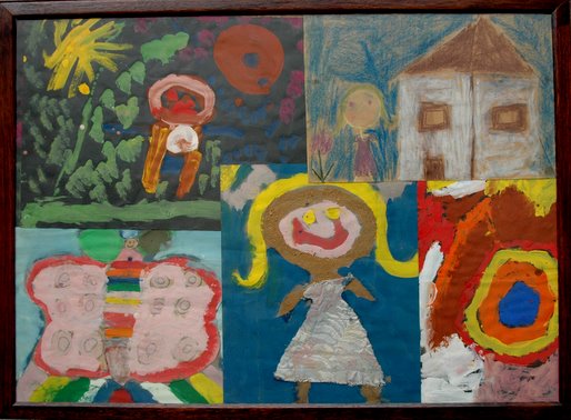 …This collage hangs in our home and I hung it years ago, when, as young parents, we had very little money. I bought a second hand frame for a few cents and fixed it at home.  It was our first “original painting”. And it still looks the same. These drawings are of their first recognizable drawings, don’t ask me when, I can’t remember…