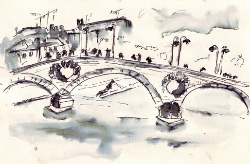 The next sketch of Pont neuf, crossing La Garonne, was done in handmade sketchbook, 22x15cm in rotring artist pen and wash.