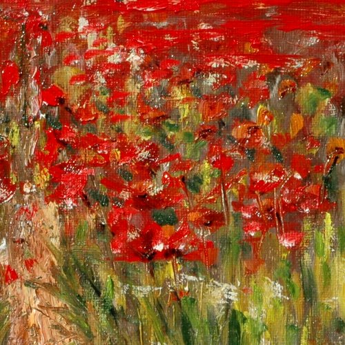 These fields of poppies seem too gorgeously red to believe!! and your painting is… awhh… so very beautiful!! I love the light you’ve created there. I don’t know why it makes me think of Hopper, may be light is the connection; elle a un je-ne-sais-quoi de triste ou de regret… peut etre le regret de ne pas les avoir peint la première fois?