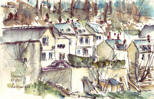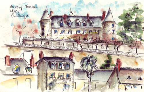 So, Yesterday. I stopped across the river Loire at Vouvray, a quaint village with houses set into the cliffs next to the Loire. Parking my car in the sun, flinging open the door, basking in the warmth of the sun, I did these two sketches at the same spot. Just moving my focus on with the road. With the first sketch, Vouvray 1,  I used my new bottle of black  ink to draw with, not realizing I bought water soluble ink. So when I washed with the watercolour, all the ink just flooded all over. With the second sketch, Vouvray 2,  I just fell back on my rotring tikkky graphich pen to draw with and then added my wash of water color.