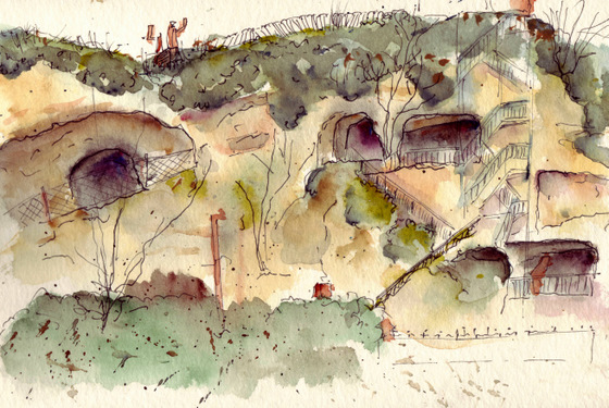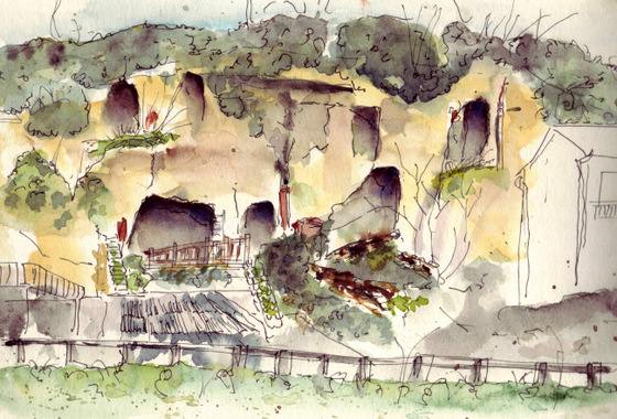 I went down the road this morning and sketched two spots where the caves/troglodytes are still inhabited and a smoke trail is often seen escaping the hidden chimneys.