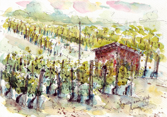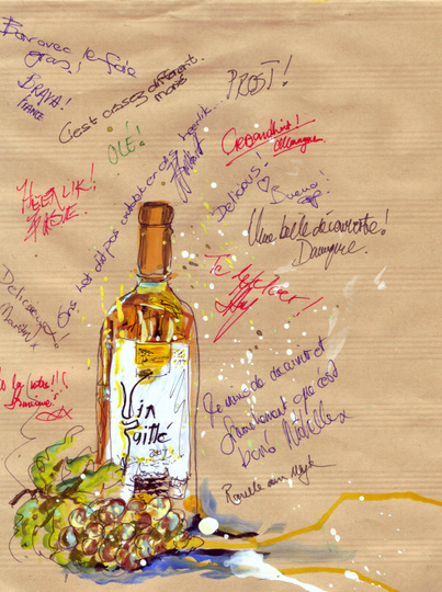 The months are flying by rapidly and we’ve already sent off  6 postcards of 13, almost halfway through. For this card to Martin, I decided on the vineyards here in Correze…our specialty wines, Vin paillé, meaning straw wine. The grapes are semi dried on straw beds and then pressed.