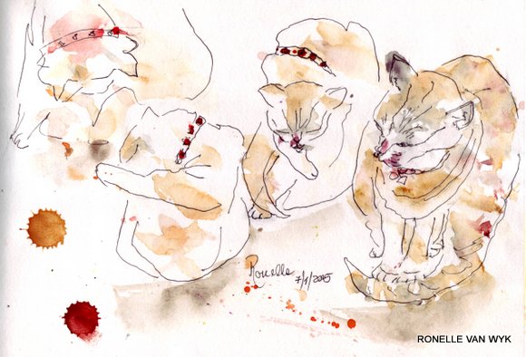 Tokala was chosen as the model, because she has a lot of finicky tricks when grooming herself. A good thing she isn’t a human, she would be unbearable! I caught some quick movements which are actually more gestures than anything else and one or two poses that she was willing to keep for longer. Good exercise to focus and concentrate. the colour was added later after all the sketches were done.