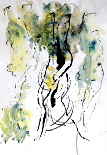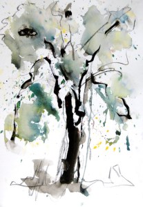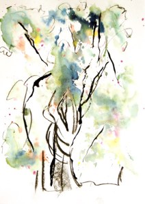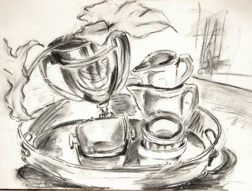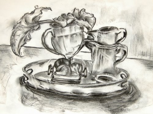 The first drawing is the one I did yesterday afternoon and I really struggled. The minute I take a drawing tool like a pencil or charcoal in my hand, I tighten up and it turns out a compact, heavy little business. So last night I attempted another one, number two. Unfortunately we’ve had the figs for dinner, so the set up is a little different and my angle changed a little too. This drawing is probably messy and sloppy and quirky, but I’m much happier. Still not what I’m after, but at least it has less “rendering” and more movement and energy. (And yes, the trophy at the back is quite skew, it is bent at the bottom)