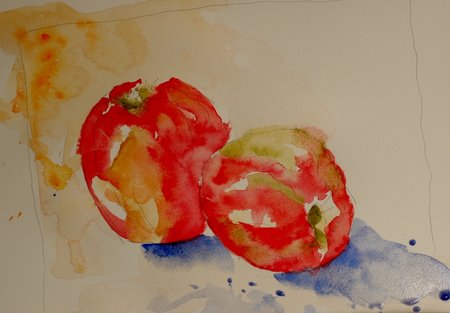 My washes are very watery in the beginning, done with a big brush. The goal here was to follow the yellow in the apple and tie it in with the background, top left.
