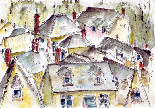 When working in watercolor, I use only one brush, usually my Rosemary sable 12. My splashes are done right at the end with the same brush. Depending on the subject and the atmosphere I want to add to my sketch/painting, I choose from 3 different types of splashes. I call them for my own use, splashes, splotches and spatters.
