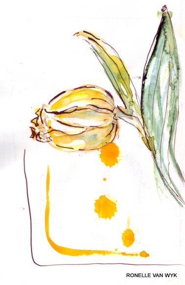 In the sketch below, I used only a green splash and blue splotches to suggest sky and leaves and I like the effect of stark lines with the contrasting wild bursts of colour.