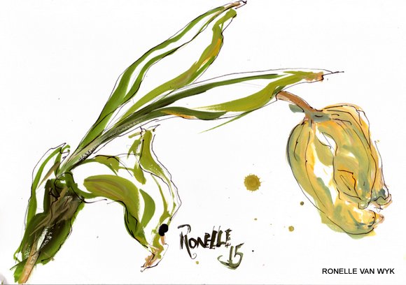 Two Siberian iris sketches – Left: Only 2 big splashes. The line work and minimalist appearance of the sketch doesn’t welcome tiny spatters of colour, it would only distract. Right: The more loose watery interpretation allows for some large splashes as well as some spattering. It adds to a frivolous interpretation and could suggest picking of the irises, blowing in the wind, petals falling…movement.