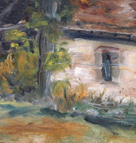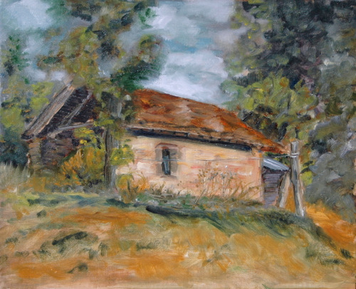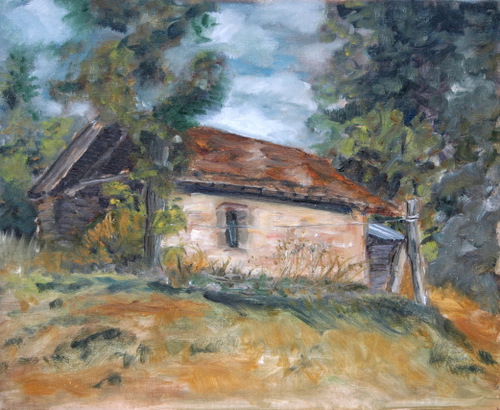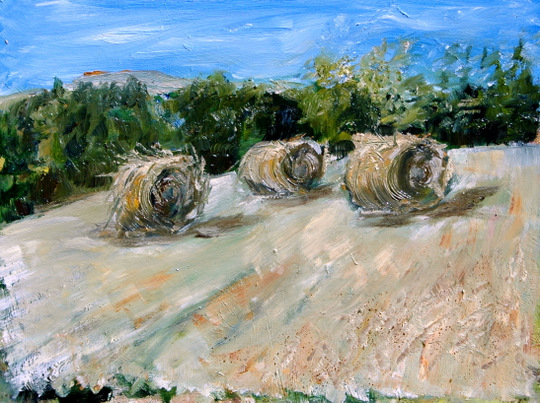 I love the bales of hay standing all around the countryside at this time of year, soon to be stored for the winter. The days are hot and the evenings linger long before the starry nights set in. Perfect summer days. Today was one of those days. The temperature stood a 41 degrees C(105 degrees F) when I took my oil paints just down the hill to capture the hay balls before they’re stored away. I used an old flop painting and started painting over it. Don’t think I’ll do it again, I felt distracted by the already painted scene on the board.