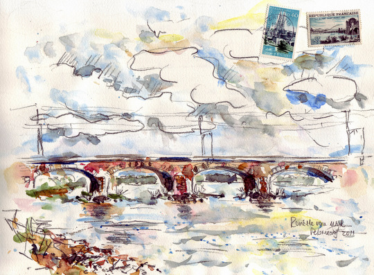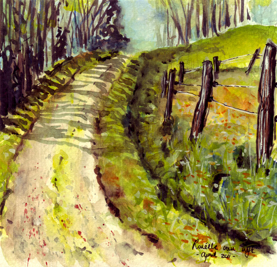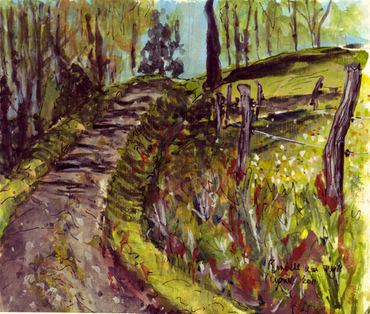Fortunately, the little road leads up to our house at Coin Perdu and seeing it was close by, I could easily take my chair and goauche and try another one, which I found better, lighter.(painting 2).