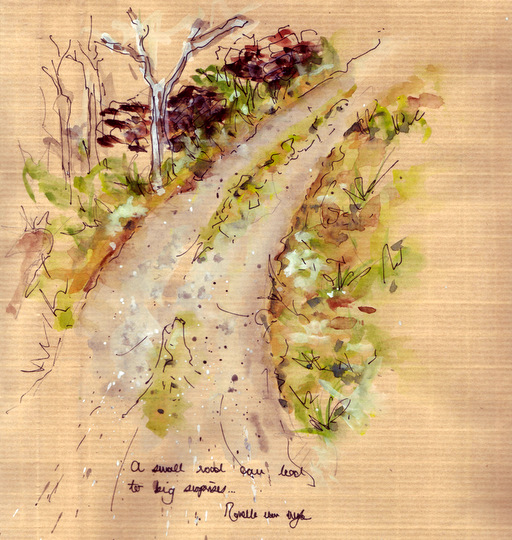 I decided on a “small road”, done in gouache for myApril postcard to Robyn. Starting with the envelope, I painted in gouche a quick sketch of what I would like to do on the postcard.