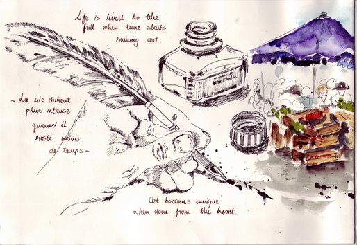 A sketchbook exchange is a wonderful way to move a bit away from what we do normally in our art, “our signature work” so to speak and try out something different, still putting our own “signature” on whatever we do…pushing the envelope. I think that when this sketchbook exchange project is done, we’ll all look back, and discover that apart from the fun we’ve had, we will have learnt new ways, techniques and creative playing-around , grown in directions we wouldn’t otherwise have discovered…I know I will.